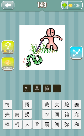 疯狂猜成语中,一个人在拨草 一条蛇是什么成语